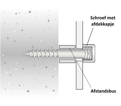 Sierschroeven worden vaak gecombineerd met afstandsbussen om het geheel met een afstand op de gevel te bevestigen. In de tekening kunt u zien hoe de beide producten gecombineerd worden. Ropro verkoopt ook bijbehorende afstandsbussen in meerdere varianten, zoals kunststof en metalen afstandsbussen. Voor de afstandsbus categorie klik hier.