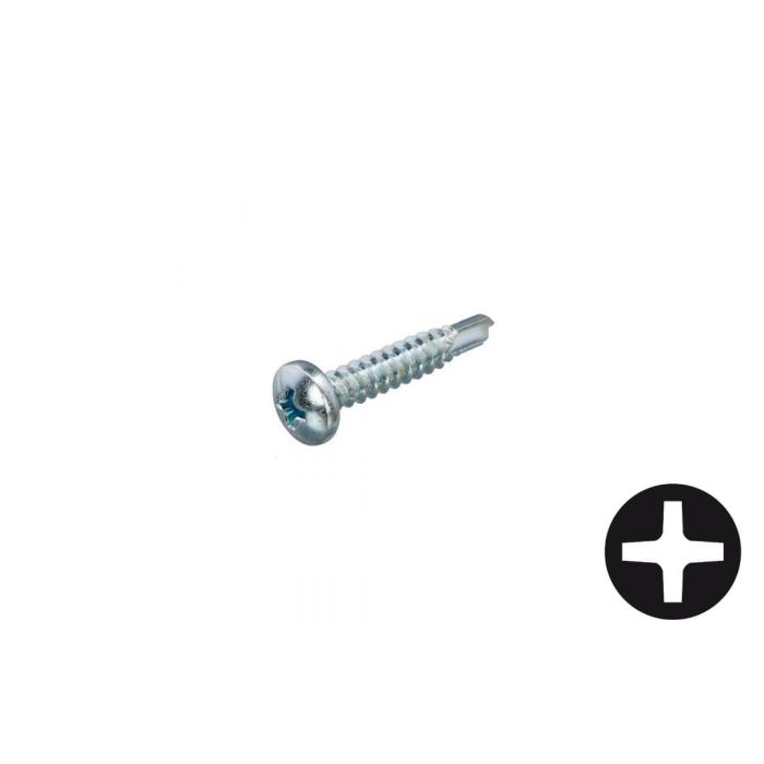 Zelfborende plaatschroef. Deze plaatschroef heeft een bolkop met Phillips aandrijving.